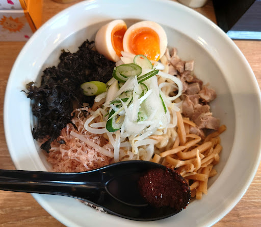 まじそは中盛り頂きますた。 最初に小盛りとライスにしようかと小盛り押したが、ライス売り切れの為中盛りに変更してもらいますた。追加で現金100円支払えば出来ますたよ。 太麺そうなので提供まで時間掛かるかと思ったが意外と早めに着丼しますた。 まぜそばなのでしっかり混ぜてからと思ったが、レンゲの辛味噌が邪魔で混ぜづらかったですたよ。 まずは辛味噌溶かさず一口啜ったら、甘い!ですた。甘いラーメンが得意ではなかったが食べ進める内に甘じょっぱいに慣れてきて、辛味噌を少し溶かしたら辛味だけじゃなく爽やかな香りが加わり大人でオサレな味に変わりますたよ♪でも辛味は結構あるので注意が必要ですだ。 後半、バラ海苔が溶けてきてしっかり香り出てきたとこ辺りで割りスープ投入してみますた。丼預けるタイプなのね? 少し残した麺を泳がせてスープを飲んでみたら、魚介のしっかりした香りが立ちジャンクな味わいからガラリと変わりますだね。一瞬こっちがホントなのでは?なんて思っちゃいますた。 最初はもっとニンニク効かせてジャンキーにしたかったが、割りスープを考えたらこの...