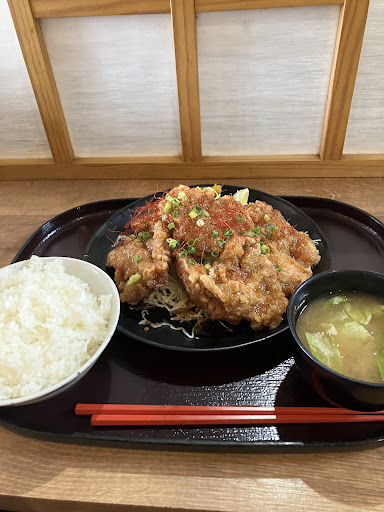 唐揚げ定食を求めて大盛やもり達さんへ。玄関先の立て看板で、食券制なのを確認。銭湯の様な下駄箱は鍵が無く、使用未使用が開けなければ判らないシステム?恐る恐る店内へ、どどーんと券売機が明るくお出迎えしてくれます。店内はパンクロックがガンガンで店員さんは気がついてないのかな?食券を買ってテキトーに空いてるとこに座って待ってみます。水や🥢ソース、ドレッシング等は別カウンターで完全セルフで食後も返却口に返すフードコートスタイル。しばらくして番号が管内放送で呼ばれて受け取り口に取り行き、カウンターでハシ、ドレッシング、お手拭きとって着席。うーん。フードコートシステムもいいが、味と値段とサービスのバランスが悪いと感じるから、リピート無いかな。味噌汁は美味しかったですよ。