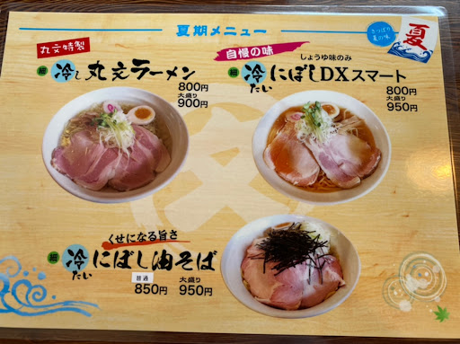 (夏季限定) 冷たい丸文ラーメン、魚介の効いた冷たいスープ。 冷たい味噌ラーメン、辛味噌にマヨネーズ、大量の豚肉が冷たいスープによく合います。冷たいメニューで断トツで好みです。 冷たいにぼしDXスマート、煮干し香る冷たいスープ つけめん、昔を思い出す酸味の効いたつけ汁 https://youtu.be/0ltxHYzUvlg