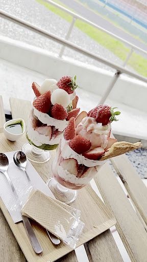 ここは体験農園の美味しいいちごパフェ。 大きく明るいおしゃれな農園はとても混雑しています。 大きな駐車場はかなり車が止まっていました。