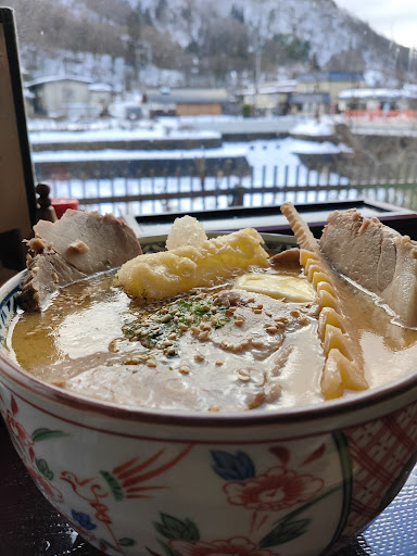たた、今回の目的は蕎麦ではなくラーメン。もちろん蕎麦がメインの繁盛店で間違いないのだが、蕎麦屋が作るラーメンの域を越えていると評判になっている冬期限定ラーメンを紹介する。麺は全粒粉や県産小麦粉の「ゆきちから」を使い、手間の掛かる「青竹打ち」で作る歯応え抜群の太縮れ麺。暖かい店内で山寺の雪景色と川の流れをゆっくりと眺めながら味わえる自家製麺は唯一無二で、評判通りまた麺を目当てにまた行きたくなるラーメンでした。