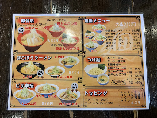 平日の13時頃に訪問。先客は二組程度。席に余裕あり。 店員の出迎え、店内の雰囲気などのファーストインプレッションは良。 座席に案内されて注文。割安のランチメニューが充実しており、薄給サラリーマンにはありがたい。 人気No.1の焦がしガーリックバターの味噌とんこつ麺とまかない飯を注文。