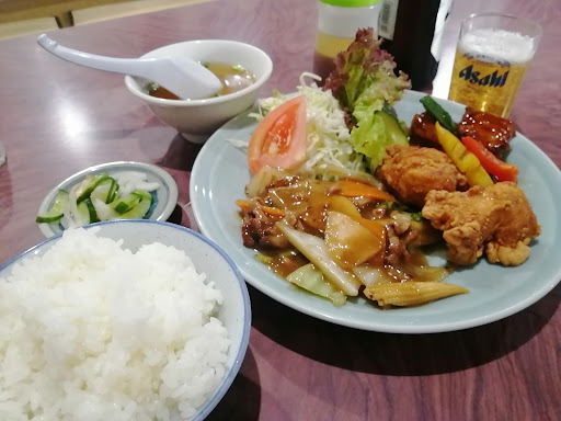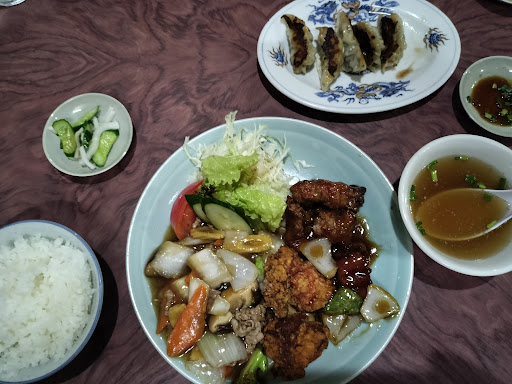 Read moreKDDI維新ホールにてコンサート参戦の為こちらに。その前にちょっと早めの夕飯にと、夜のオープン17時ごろお邪魔しました。店内入ると小上がりの畳敷き席が6つあり、カウンターはなく団体メインな中華系らしからぬ間取り雰囲気のなか着席し、先客なしでさっそく、桃花園ランチと餃子を注文。中華なべを振るう心地よいサウンドに耳を傾け、 ほどなくすると到着。 なかなかの速さに感心し、そのボリュームに感激! そして白米、スープ、漬物もついて値段も1300円とは、リーズナブルではないでしょうか。メインどころの、八宝菜、酢豚、唐揚げの3品にサラダが乗り、餃子も小ぶりだか一皿6つのなかなか肉肉しい感じで、しっかりした味付けでお腹いっぱい美味しくいただけました。われわれが食べ終わるころ二組の客の来店ありで繁盛しておられます。また駅からも徒歩圏内で有料駐車場もたくさんあるので、この辺りに来た際、またお邪魔したいと思います...
