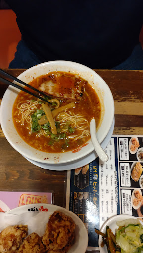 Read moreお昼時に行き、豚骨ベースピリ辛ラーメンと、もやしラーメンを注文。 連れが食べたものは、豚骨ラーメンとは違う、初めての味だったらしく、くせになりそうな味だったようです。 私が食べたもやし醤油ラーメンは、あっさりしてて、食べやすい味でした。 チャーシューは、厚さがあった分、ちょっとパサついた食感でした。 麺はストレート麺で、ちょうどよい硬さ。 唐揚げは、ニンニク風味で、外はパリっと中はジューシーでした。 漬物おかわり自由で、ニンニクの芽ピリ辛の物が一番減っていました。 近くにあれば時々通いたいですが、遠いので残念です。 先日、2回目行って来ました! 14時頃行ったので、混んでなかったです。 また醤油ベースラーメンを注文。 チャーシューが分厚くて食べごたえがありましたが、油身の部分も大きかった分、あとで胃もたれしました。 福岡にあるラーメンとは違い、細麺ストレートなんだけどスープが少しとろみがありつつのさっぱり味…? お箸に、何かついてたものがあり、それをよけて取りました…(_; もう、わざわ...