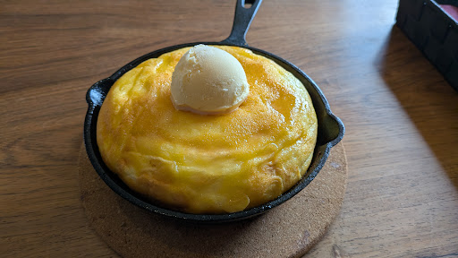 おヒゲの優しいマスターさんがいる店。オープン早々に行きましたが良き対応をしていただきました。駐車場は店前に7台分。店の表示があまりなく一般宅と間違う可能性もあり(笑)店内雰囲気はジャズが流れ落ち着きのあるデザイン。 パンケーキとフレンチトーストとコーヒーゼリーをいただきました。ドリンクはオススメのエスプレッソトニック。パンケーキは1から作るので注文時に時間がかかることをつたえていただきました。約30分で完成、穴を中央にあけるとバニラアイスを乗せていただき完成。パンケーキ自体はバター味、バニラアイスを中に入れ少し溶かし纏わせて食べたらうまうま!メープルシロップがあると良かったかも?フレンチトーストはふわふわ甘々でうまうまでした♪コーヒーゼリーは正直言うとスプーンを入れたらクリームが溢れ食べにくかったかな?味は最高にうまうまでした♪オススメしていただいたエスプレッソトニックはトニック自体が大好きなのもあって最高にうまうまでした!帰り際にマスターと少しお話させていただきました。アフォガード風フレンチトーストもうまうまと聞いてまたの来店を決意(笑)相互的に少し値段は高めかな?とも思いましたが結果的には満足出来ました♪前の道が一方通行(7:30〜19:00)で倉式珈琲店、セブンイレブン側の道からは入れないので注意です!ひで歯科を左折しそのまままっすぐ行き左折で店舗に入れ...