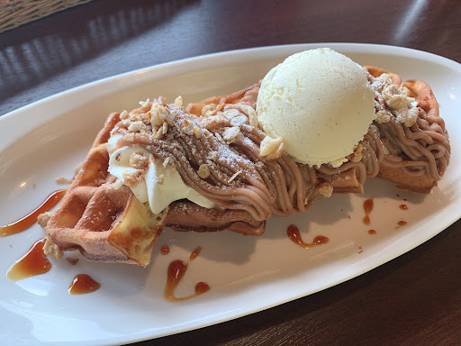 出かける前に軽く食事をしてしまっていたので、 スイーツ系メニューがいいなぁと ホイップとバナナが添えられたワッフルをオーダー。