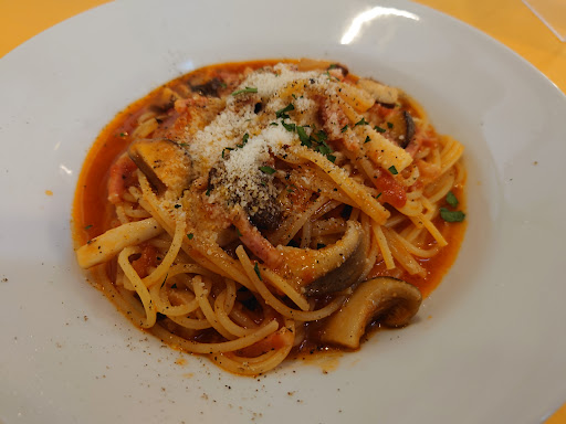 The ambiance was nice. It's kept spotless. It was comfortable. The ice water is done up with some nice citrus and mint. I was in the mood for something spicy, so I ordered the aribiatta. The menu offers a warning that it's very spicy. Perhaps for the Japanese palate, it may be, but I found it quite mild. The flavor was about average, or perhaps a little better. The salad was nice. The bread was warm and soft, but there was one small slice of two different breads. I might have enjoyed a little more bread for the total price I paid. A drink and a selection of dessert was also included...