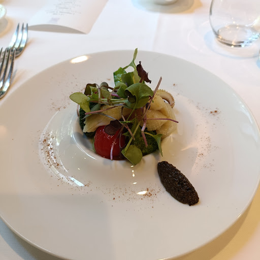 令和7年5月31日(土)の正午にお伺いしました。毎年この時期にフレンチを食べるのが我が家の恒例になっているので、ランチで使わせて頂きました。4000円のおまかせコース。メインがお肉だけになりますが、一品1品のポーションが大きくて大満足でした。 アミューズのパプリカムースで胃が動き出し、サラダのブロッコリーソースを付けて食する甲イカの炙りで食欲全開となりました。グリーンピースのポタージュのクルトンは絶妙なサクサク感。そら豆とグリーンピースの季節の旨味を更に引き上げます。そしてメインはむつみ豚のポワレ。アサリ出汁の効いた焦がしバターが肉の脂身と渾然一体となって美味いのなんの。そして脇を固める野菜の緑が目を楽しませ、食べては舌を唸らせます。肉は結構な量がありましたがペロリ。最後はアイスとコーヒーで締めました。食事中の飲み物は最初がハートランドビール830円。ポワレが出てきてからはフランスのグラス赤950円。若い感じでしたが、飲みやすく中々のお味でした。 お店は入口がケーキ売場になっていて、奥の大戸を開けるとレストランエリアになっていました。オーナーシェフのお出迎えとお見送りが嬉しいサービス。お味も素材も素晴らしく、商店街の中に宝物を見付けた感じです。予約はラインから行いま...