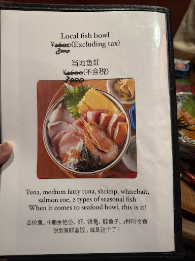 4000 yen for a small donburi with unfresh seafood. The sashimi was paper-thin. They present tourists with a special menu with inflated prices, and if you attempt to order a cheaper item from the regular menu, they'll claim it's "sold out”.