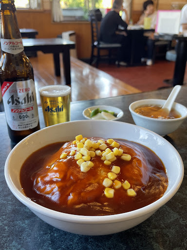 さて、注文。メニュー数が多く、選定には難航したが、オレは天津丼(表記はかに玉ご飯)と餃子、ツマは半五目チャーハンをお願いした。 天津丼はケチャップ系の餡でやや甘めの味付け。卵はしっかり焼いてあり、他所ではあまり見ないコーンが乗っている。 中の具材は筍、椎茸、人参、玉ねぎは確認できるが、カニの気配は感じず。全体的に量が多いのが印象的だ。 餃子は野菜と肉がバランスがよく入りほんのり甘め。ジューシーさもあって美味しいね。 五目チャーハンはしっとり系で濃いめの味付け。チェイサーのスープはちょっとしょっぱ目かな。 「半」のはずだが、どう見ても通常サイズである。