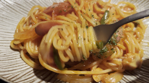 【ナポリタン】 カフェの定番のナポリタン。ウィンナーもゴロゴロと、ピーマン、玉ねぎと入っています。量は決して多くはないですが、子とシェアして頂きます。もにゅもにゅパスタと昔ながらの美味しいナポリタンでした。これをお腹いっぱい食べたいもの。野菜嫌いな子供も、ピーマンを渡したら、きちんと食べてましたね。