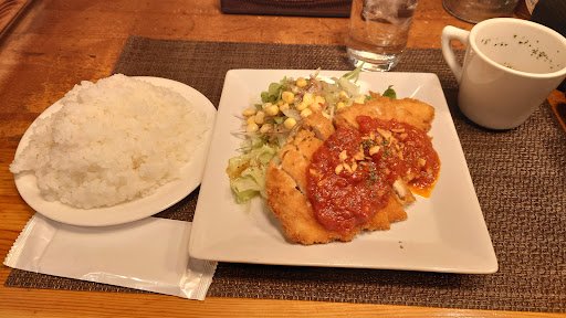 2024.01.29.平日月曜日のランチで初訪問させていただきました。13時少し前の入店で先客は1名。日替わりランチのチキンカツガーリックトマトソースかけ=800円をオーダ。