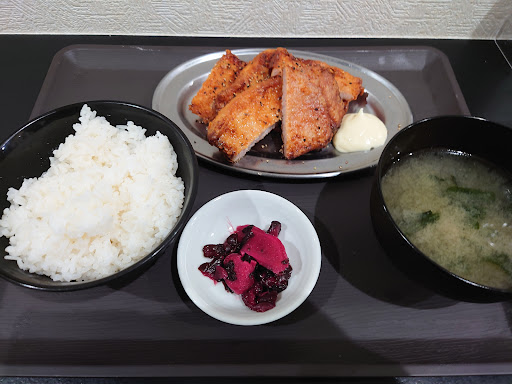 他の人のクチコミと写真。あと、やまとぴの記事と写真を見て期待して行ってしまったので… たった10日ほどで、値段はそのままなのに、内容は大きく変更があったようで。 ①からあげが唐揚げっぽいコロコロ形状ではなく、生姜焼きのような薄切り肉タイプになっていた。 ②豚汁→味噌汁(具はわかめのみ) ③生卵がつかなくなった。