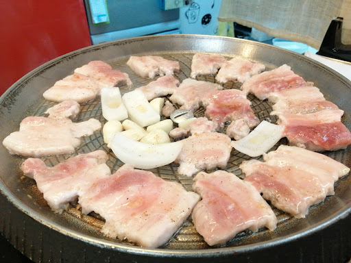 ◇しお焼サムギョプサル(野菜セット付き、2人前2,900円) お店の人が焼いてくれて、カリカリ感がある絶妙な焼き加減。テーブル席で煙を処理する施設が無いから、こちらで煙が出ない様に焼いてくれているとのこと