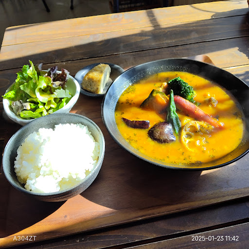 (2025/01/23) 桜ヶ丘中央病院の人間ドックを受診し、そのランチサービスで、ランチどれでも選べますということで、桜ヶ丘駅前のカフェかじふちさんにお邪魔しました。 4つあるメニューのなかから一つ、スープカレーを選びました。 スパイスの効いたスープカレーの海に沈むのは茄子やかぼちゃ、じゃがいも、れんこんなどの野菜と、ホロホロのチキンにソーセージ。 刻み玉ねぎはスープの海に沈んでいます。 辛すぎないスパイスが絶妙で、食べ進むたびに体がポカポカしてくる印象、これは美味い。 ご飯が白米より五穀米とかだったらより良かったかなーと思ったけれども、程よく火の通った食材の組み合わせは、コレで良き。 人間ドックでお預けになっていた胃袋に、優しい温もりを届けていただきました。 美味しかったです...