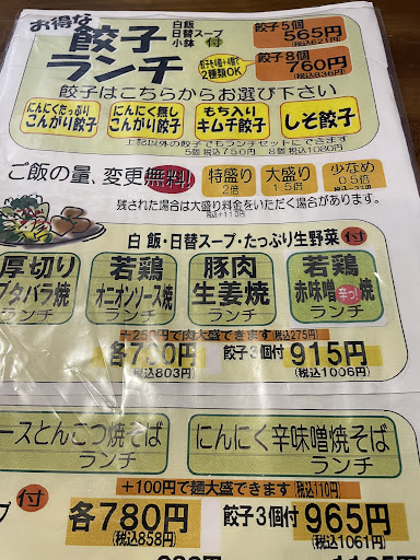Read more鍋とオム焼きそばを頂きました それなりの時間に入店して客が居なかったので不安でしたが味は上々 大きめの餃子には具材の大きさが一工夫されていて食べごたえ十分 味噌とんこつ味も餃子の邪魔をしない程度に調整されていてとても食べやすかった 定食の場合ご飯の量がちょっと少ないのでもう1品頼む人が多いかと思います オム焼きそばは味はいいもののソースの量が多過ぎたのでソースを取り除いて食べても味が濃いくらいだったのが残念 好みではありますが見栄えよく上からもソースをかけるのであれば麺の味付けは控えめにした方がいいかと思います 例えるならたこ焼きに通常の2倍のソースがかかっているような物でソースの味が強過ぎました しかしながらお店の雰囲気もよくゆっくり食べれるところでしたのでまた行きたいと思うお...