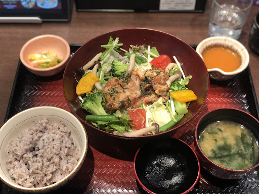 This chain is one of my favorites in Japan. I love the grainy rice they serve here and all of the fresh vegetables that come with this salad I order with chicken or fish. Good variety of food for a decent price. I believe this set was...