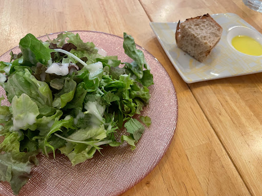 【ワカサギレタス、ミニトマトのジェノベーゼソース/1250円/税込】 ◼︎サラダ リーフ、水菜を酸味のあるドレッシングで食べるサラダです。 んんー、やはりドレッシングが生きるとリーフが美味しいです。