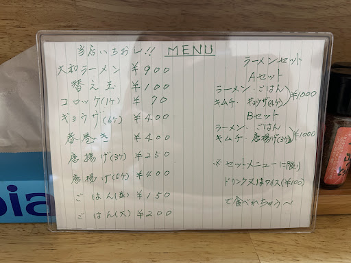 今日の夕飯は、ラーメン大和さんで、Aセット1,000円を頂きました😁❗️店主自慢の大和ラーメン、大和郡山市に店舗があるからこそ、名乗れると思いますが、本当に自慢出来るとは思えません。20時20分位に到着、お客様はおらず、カウンターの中にいた店員さんに、席を案内されましたが、暇だったのか、カウンターに座って休憩していた席に、案内されました。私はお客さんがいるのではと、聞きましたがいませんと言って、たばこと灰皿と飲み物を、カウンターの上から片付けました。この時点で最悪です。飲食店では、禁煙が義務付けられているはずです。店員が吸っているとは、言語道断許し難い行為です。お客さんを舐めています。爪は紫のネイルあり得ません。3月で閉店して5月位にリニューアルオープンされたそうですが、片手間で営業しているようにしか見えません。スープは、味噌ラーメン❓塩辛い。チャーシューも塩辛い、餃子は揚げ餃子。先代の店主と店名に対してどう思っているのでしょうか。食材には罪はありません...