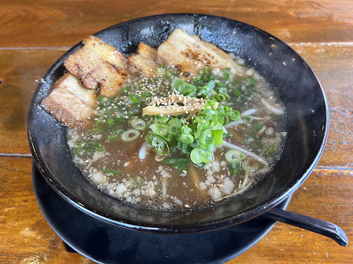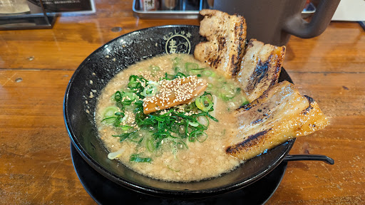Read more豚骨が自慢!濃厚スープのラーメン! 郡山警察署の道向い。地元の方で平日の客入りも上々。今回は極厚タレ叉焼麺(みそ味)を注文。先客の注文もありましたが、提供は早かったです。 先ずはスープ。豚骨スープをベースに味噌を溶いたのでしょうか?それとも九州味噌なのか、かなり甘めの味噌味。背脂やタレチャーシューも甘さの一助となってそうです。辛味噌やとんこつもあるので、甘味噌が苦手ならそちらの方が良いです。しかし、コレはコレで美味しかったですが、好みは分かれそうです。 麺は博多豚骨に近い低加水の細麺で、味噌味には少し麺が負けてる感じです。太麺でもいいかも。 チャーシューは豚バラでタレにつけて焦げ目がつくまで焼かれています。極厚の名の通り食べごたえはすごいです。