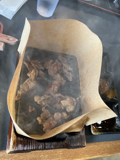 Read more奈良公園に行く途中、お腹空いたなぁ〜と思っていた時に目に入ってきたので寄ってみました。 14時前だったので、店内空いてるかなと思ってたら、満席でした。私は1人だったので、案内してもらえましたが、人気店なんですね。 入り口でお肉を選びお会計(現金のみの取扱いなのでご注意)。リブセット1,100円を頼むと、フードコートでよく見るブザーを渡されました。席に着きブザーがなれば、お肉を取りにきて、ご飯やお味噌汁をセルフで持っていきます。 タレは、おろし、ガーリック、ワサビ、ニンニクがあり、トンテキ用などのタレもありました。 甘辛の白菜キムチと高菜も無料で置いてあり、これだけでもご飯何杯でも食べれそうです。 自転車で来てなければお腹一杯食べるところですが、食べ過ぎると自転車こげなくなるので今日は我慢です。お肉のおかわりもハーフサイズ300円から頼めるので、いろんな部位楽しめそうです。チキンとか好きなので頼みたかった。 溶岩鉄板?で長くジュウジュウいってますのであったかく、よく焼く人はそのまま置いておけば、いい感じに焼けていきます。私はレア好きなので、お肉も柔らかいうちにいただいちゃいました。私はワサビ、ガーリック、おろしの順番で味変しながら、お肉を食べるのが好きなので、タレが沢山あるのは嬉しかったです。 お店もお肉を楽しむ感じなのでもう少しアメリカのテキサス感や、牧場感など出せば、いいのになぁと思いましたが、お肉好きに安価に提供してくれているので、これは諦めかなと思いました。高くなるなら、このままでお願いします。 次は極柔フィレを食べにまた来たいと思い...