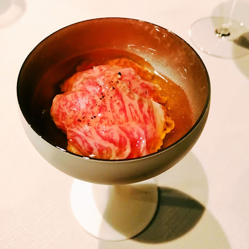 ■茄子 トマト ピザに見立てた一品。わんたんの皮にドライトマト、茄子フォンダン、67.5℃火入れ牛肉と雲丹にパルミジャーノチーズで。 パリパリの薄い生地にトマトの酸味、雲丹のコク、牛も絶妙な火入れで甘みもありチーズもあるので焼かずにピザが完成していてこれも美味い。