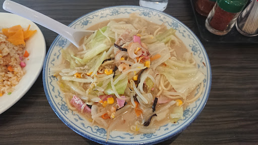 ちゃんぽんもかなり美味しい。 キャベツ、モヤシ、ニンジン、豚肉、天ぷら、蒲鉾など基本的な具材の他に、海老やイカなどの海鮮類、それにコーン、キクラゲなどがバランス良く入って、とにかく具沢山。 具材の旨味が溶け込んだ濃厚かつ香ばしいスープは、まろやかさや甘味も感じ、とにかく絶品です。