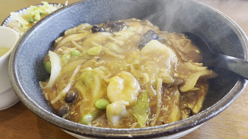 海鮮あんかけチャーハンのスープセットをいただきました。 エビ、イカ、アサリ、を惜しげもなく使用され、それらの海鮮は火入れが絶妙で味は優しく、餡はしっかり目で好みのタイプでした。 チャーハン自体もしっかり炒められているのが餡に隠れていても感じられ、チャーハンと餡の塩味がまた絶妙な塩梅でした。