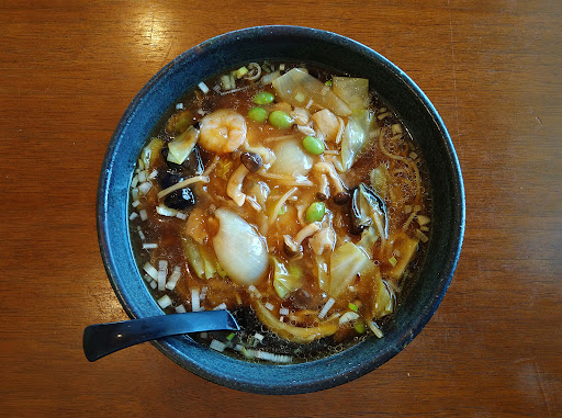 柳川市三橋町今古賀、福岡県道767号線沿いにある中華料理店です。「福岡県柳川総合庁舎」の東隣りにお店はあります。店内はテーブル席と小上がり席が用意されています。駐車場は店舗周辺に数台分確保されています。さてラーメンですが、今回はランチタイムで「五目あんかけ汁そば」と「白ごはんセット」を頂きました。優しく甘い鶏ガラベースの醤油系スープとなっています。あっさり味ですが複雑で奥深い味わいですね。麺は中細ストレート麺が使用されています。具は豚肉、海老、キャベツ、玉葱、しめじ、タケノコ、枝豆、キクラゲ、刻み白ネギ等といった具材が熱々の餡にまとめられています。ボリュームもそれなりにあるのでかっつり行きましょう。大盛り対応なし(メニュー表記なし)、替え玉制なしとなっています。「白ごはんセット」の方は、白ごはん、サラダ小鉢、漬け物、一口杏仁豆腐といった内容で、可も不可もない感じですが、食後の一口杏仁豆腐は地味に美味しかったですね。その他の麺類メニューは「五目あんかけ焼きそば」「四川タンタン麺」程度となっています。ランチタイムのメニューは数種類の飯物とサービスランチ程度と少なめですが、夜メニューは単品メニューとコース料理がそれなりに用意されているようです。 大牟田市のホテル中華等で修行された店長が、故郷の三橋町今古賀にてお店を出されたのが2011年6月の事。最初のお店は現在の場所からマンションの裏手に回り込んだ所にある目立たない店舗で、本当の意味で隠れ家的なお店でした。2018年8月には現在の場所に移転されています。かつて「アート·ヤナガワ」が営業されていた場所になります。お洒落で清潔感のある店内、しっかり声を掛けてくれ...