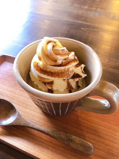 Read more古民家カフェです。 コーヒーは注文を受けてから挽くようです。 カップは名のある工芸品作家作らしいです。 スプーンも木製でいい感じです。 インドカレー屋さんと同じ匂いがするので、 カレーはそっち方面の味付けなのでしょう。 ソフトクリームはコーヒーカップに入ってきます。 古さとモダンさが程よく調和した店だと思います。 お客さんが集中すると、出てくるのに時間がかかるようです。