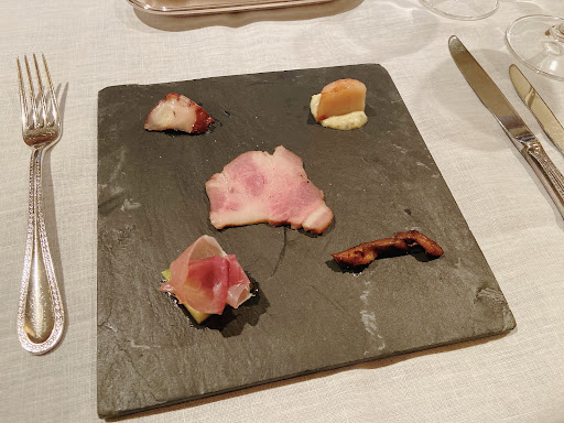 まず前菜。 生ハム等 ポンとおかれたのみで ワクワク感も感動もなく ちょっと残念でした。 スープは 乾燥したか揚げた パスタ状ごぼうが スプーンに収まらず がさつな食べ方になるのが 気になりました。 お口直しのシャーベットは グラスに盛付け冷凍していた様で ガチガチでしばらく放置して 柔らかくなってから 頂きました。