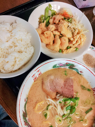 ※小エビ天セットのラーメンは豚骨にした。小エビ天はサクサク、マカロニサラダいい。中華店の豚骨ラーメンは経験上あまり期待して無かったのでまぁまぁかな?。麺硬注文もまだ柔わいけどオロシニンニクあっていいね。味噌が人気らしかった。 ご飯は普通。 ・・・...