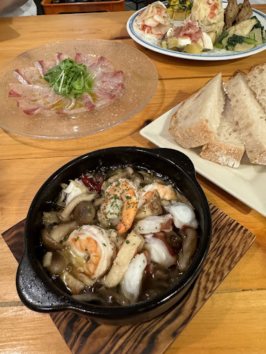 四品目 エビときのこのアヒージョ エビとキノコの香りがよくオイルもおいしかった パンのおかわりがほしいほどであった