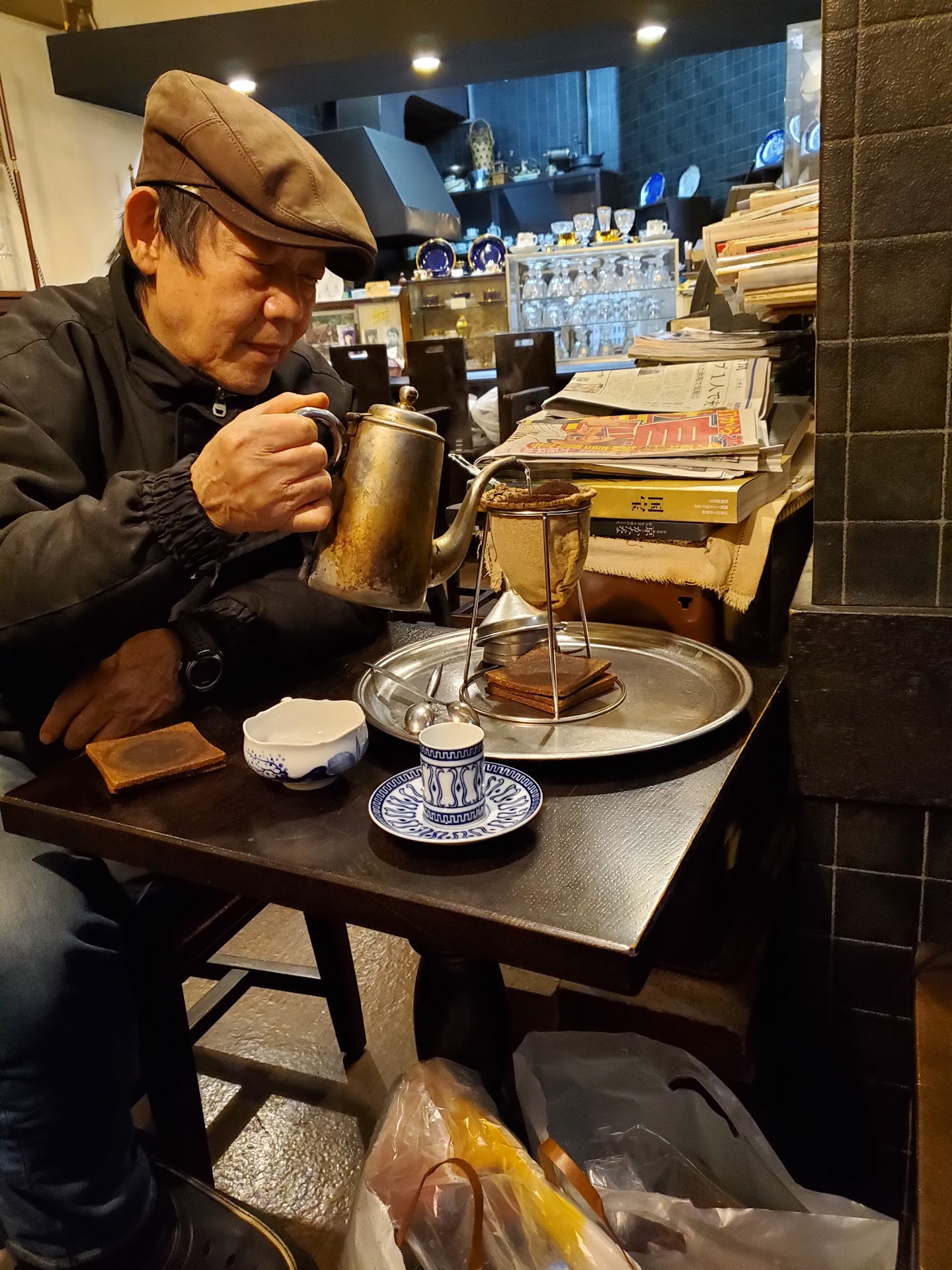 Entering into the cafe, Tanaka san, the owner of the cafe carefully explains his menu and i chose the mandehling demitasse coffee (50 min wait which you get to watch), aged strong coffee (15 to 20 mins) and cheese cake.