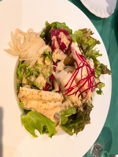 Read moreきのこのサラダ(800か900円) このサラダ、注文を受ける度に冷蔵庫から出して盛り付けてるとはとても思えないほどにぬるかった、常温ですね。 サラダは冷たいものが食べたいのでそこにまずびっくり。 そして、ドレッシングがまさかの市販のごまドレッシングです。 仮に手作りならあまりにも市販の味に酷似していたので、もっと味を改善すべきです。
