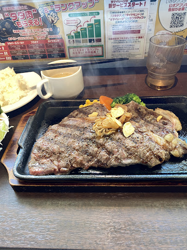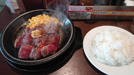 Read moreフェアで10%増量だったんで行ってみました。 立ち食いじゃないのは知ってましたが、席で普通に店員さんがオーダー聞きにくるとは思わなかったです。 ランチのワイルドステーキ300gで330gになった訳ですが、ボリュームもあって美味しかったです。ご飯も無料で大盛になりましたし。肉がほぼ赤身状態ですが、結構プレートに押しつけとけば焼けますね。 それと、付け合わせのコーンが屋台のトウモロコシっぽい味で美味い! 2人同じの頼んで3,003円でしたが、アプリダウンロードして、3,000円チャージすると1%増えて3,030円になり、クレジットカードですぐにチャージできるんで、クレジットカードでそのまま払うよりほんのちょっとお得です。もちろん通い続けるなら10%の還元率は大変お得ですが、通い詰めはしないなあ。 店員さんの接客は、私の時...
