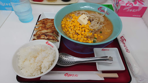 味噌ラーメンが主力っぽかったので味噌バターコーンにして、無料の半ライスと「ご一緒に餃子はいかがですか?」の一声に負けて餃子まで頼んでしまいました。