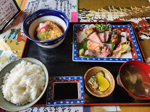 ランチメニューもなかなか豊富で選べない。 なので(多分)一番人気であろうさつま富士定食をチョイス。 刺身、天ぷら、出汁巻きのフルセット。 迷ったらコレ。 寿司が食べたい人はにぎりの盛り合わせ定食が良いらしい。