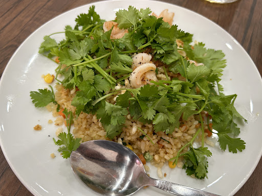そして海鮮チャーハンが来た。 パクチーを手でちぎりながらトッピングしていると、通りかかった女性の店員さんが「パクチー好き?」と訊いてきた。 「大好き」と答える。 日本人はパクチーが苦手な人が多いとおっしゃってた。