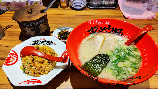 私、豚骨派です。近くに"ずんどう屋"めっちゃ嬉しい♪破竹の勢いで勢力を拡げていらっしゃいますね。期待に胸を膨らませつつ訪問しました。 11時オープンの約7分前に到着。既に2組が待っておられました。急いで車を停め3番目に列ぶと、直後に次々とお客さんが。開店時には20人ほどの行列でした。 私はお一人さまなのでカウンター席に。カウンター席でも結構なスペースが有り、隣が気にならないのは嬉しいですね。 豚骨派ですが、来○亭にもよく行きます。【こってりカタ麺+背脂多め】が私のマスト。でも現在、来○亭では"背脂多め”休止中(T_T)で、背脂禁断症状を解消すべくこちらに。「ずんどう屋」には”背脂多め”以上の”背脂まみれ”のサービスがあるんです♪豚骨+背脂まみれって、盆と正月が一緒に来たような感じでテンション上がりまくり(笑)更に、にんにくをふんだんに使った【にんにくチャーハン】なるものが最高との噂。というわけで、今日は【元味ラーメン】麺カタ背脂まみれ+【にんにくチャーハン(小)】をオーダーしました。食べ放題の高菜漬け(辛さは控えめでラー油が効いてて美味しいです)をつつきながら待つこと4分ほどで着丼。豚骨特有の獣臭は皆無で、ほのかに甘い旨そ〜な香りがします。博多ラーメン風の正統派スープに、これでもか!というくらい大量の背脂が丼全体を覆っており危険な雰囲気が(汗)恐る恐るレンゲでスープをすくってみるとほぼ背脂。背脂層が約1cmほどもある感じ。早速一口…これはやばいっ!!美味すぎる♪♪そう、これ、俺はずっとこれを求めていたんだ!!感激!!笑...