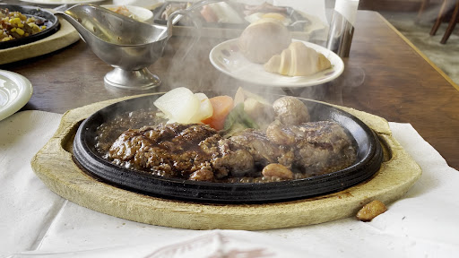ハンバーグソースもガーリック味とか選べて美味しく頂けます。 俵形のハンバーグで持って来られますが、目の前で半分に切ってお好みの焼き加減で熱々の鉄板で焼き直してもらえます。 昔はレアでもしてもらえましたが現在は多少焼き時間を確保される方向になっています。