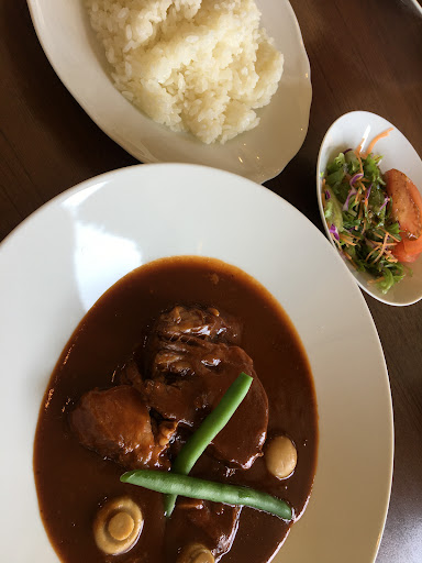 一番のウリは数量限定のビーフシチュー(ライスとサラダ付き)。 他に食事はカレーライス(ビーフカレーと野菜カレー)とハヤシライスと笹巻オコワおにぎりがメニューにあったと思う。 スイーツはぜんざいとケーキが5種類くらい(モンブラン、ガトーショコラ、いちごショートケーキ、抹茶ロール、チーズケーキ)とアイスクリームもあったかな? ケーキはここのオリジナルで甘すぎず見た目と共に上品な味わい。