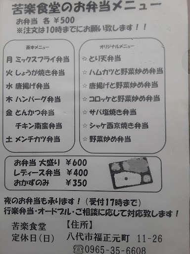 八代駅近く(日本製紙横) 民家を改築した弁当屋さん。 (レストランではありません) 電話事前予約の弁当屋さんで 当日は10時までならOK。 配達でなく引き取り型の店舗。 駐車場はなく店前や店前の 通路に停めてるみたい。 ※メニューは写真つけときます。 日本製紙の方や近くの方々が 注文され繁盛してて 一般の方も注文できます。 唐揚げ弁当がオススメ。