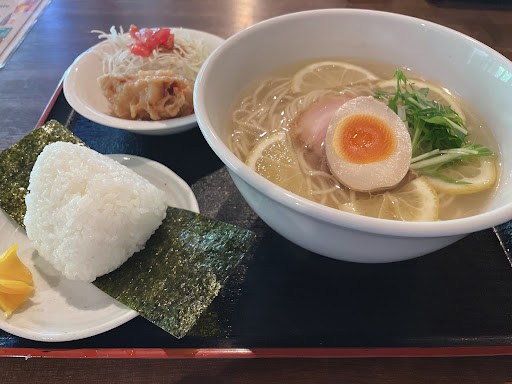 Read more今回は【よつば食堂】さんに初訪麺。 混んでいると聞いていたので11:15に訪問。ほぼ満席に近い状況でびっくり🫢 お昼にかけ続々と人が増えてきているので人気店なのが伺えます。 駐車スペースはおそらく5台です、対策して来店する事をお勧めします。 今回は期間限定復活らしき塩檸檬ラーメンをチョイス。 着座から着丼までは15分くらい。 昼時間はもっと待つ事を想定したほうが良さそうですね🤔 ラーメン、おにぎり、唐揚げ、サラダ、お漬物のセットでボリューム満点💯