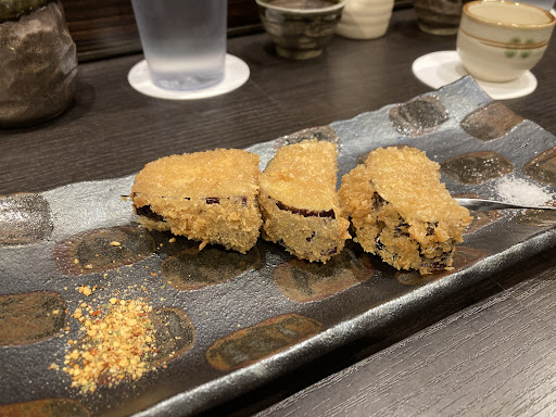 We explained we eat seafood and eggs, but no other meat. The waiter understood and helped guide us through the menu. We ordered a number of small plates and sake. Some of the plates, like the “marinated” (cured) salmon with fresh lettuce and the mustard stuffed fried lotus root (a regional specialty of Kumamoto) were both excellent. The wood ear mushroom sashimi was very good (the spicy yuzu paste served with it was excellent) as was the fried eggplant (but the eggplant absorbed a lot of the oil, unfortunately). One dish, recommended by the waiter, fried seaweed “Aosa” balls was just ok. We tried three sakes by the pitcher which were somewhat average in flavor. None stood out as being exceptional.