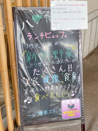 店内はテーブル席とテラス席がある。メニューはおばんざいが中心だが、目の前で作ってくれる豚しゃぶや唐揚げ、カレーやピザなど、がっつり系もありバラエティ豊か。地元野菜がふんだんに使われていて、彩り豊かでどれもおいしい。お米は五つ星マイスターがブレンドした八幡米で、地元食材を使うことにこだわっている。