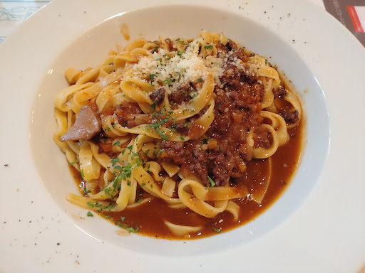 TVの料理コーナーで有名なイタリアンのシェフがミートソース作ってるのを見て…それに似てた「牛肉のボローニャ風ラグーのタリアテッレ」ってのが食べたくなって入りました。フライパンの上にオリーブオイル敷いて…牛肉挽き肉を焦げ茶色になるまで香ばしく焼き…そこに赤ワインを入れて鍋底のこびり付きを溶かしながら蒸発させて…ソフリットとトマトピューレを入れて煮詰めた感じ(どんな感じやねん🤣)を想像して挑みました。ちょっと塩気がキツ過ぎに感じましたが…それ以外はドンピシャの香味で大満足です😋ご馳走さまでした🙏最近、このお店がチェーン店であることを知り…ってことはこれ…セントラルキッチンで作っているのかと思うと、かなりグレード高いセントラルキッチンと思います。ちなみに…隣りにあったフードコートが全店撤退して長らく空地が寂しい感じでしたが、ペットショップコーナーになって明るく賑わってました。そのせいかはわかりませんが?こちらのお店も賑わっていて(写真は昼3時前です)…ちょっと隠れ家的でなくなってしまったのは残念ですが…このお店好きなんで、お店が長続きしそうで、これはこれで良かったです😊