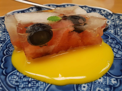◯お造り 鯛•伝助あなご•モンゴウイカ ポン酢のジュレで頂きます。 穴子も鯛の皮目も炙られいて、とっても丁寧。