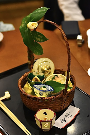 3品目 【八寸】 松花堂に咲く椿がカゴにあしらわれています。 椿の種類が1人ずつ違って、椿の名前が書かれた札が乗せられています。 風流。 カゴの中には小鉢が3つ。 カゴの外にもう1つ。