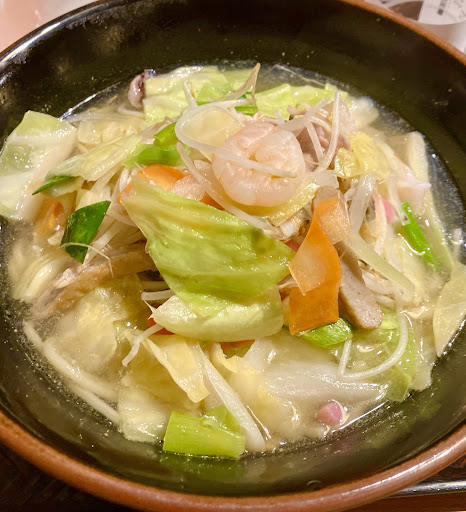 透明度が高いあっさりスープこれは美味しいねぇ、エビ、イカ、アサリ、野菜、この辺の名物のはんぺんがどっさりと入ってます! ボリューム満点でとっても美味しい!